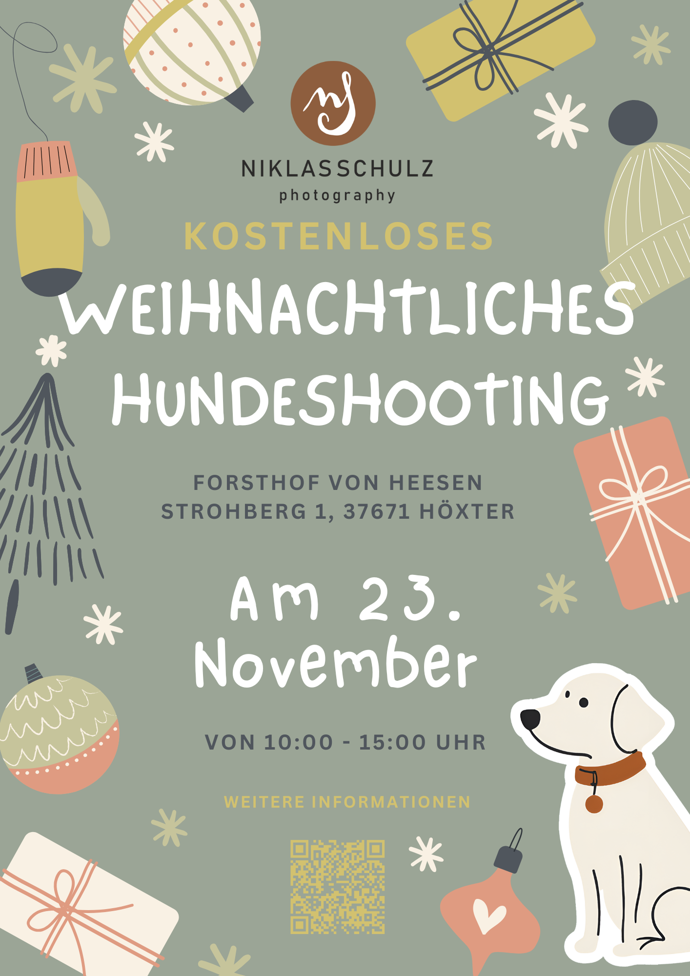 Am 23. November von 10:00 bis 15:00 Uhr erwartet euch ein kleines weihnachtliches Set-up, umgeben von Tannenbäumen, für euren Vierbeiner.